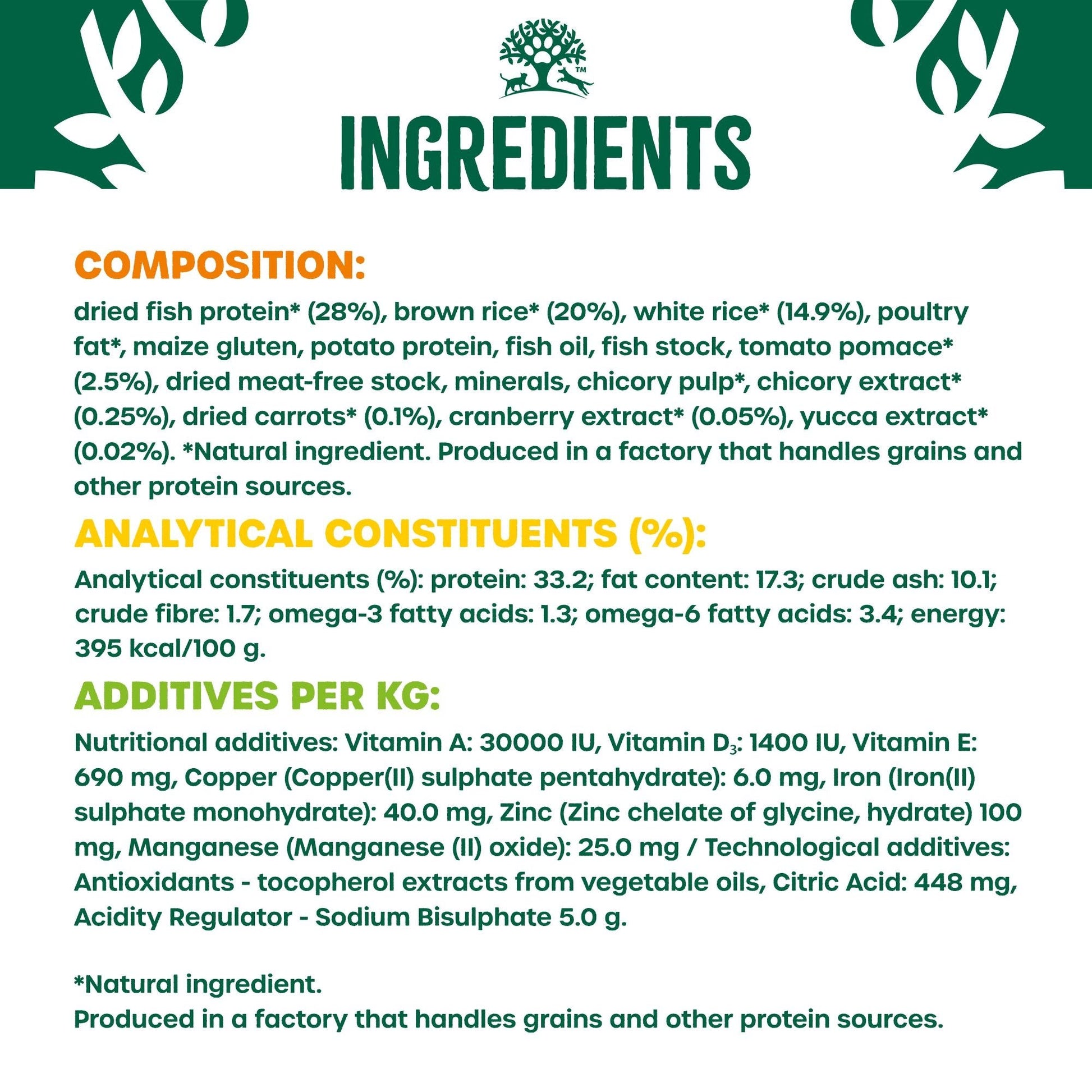 Composition: dried fish protein* (28%), brown rice* (20%), white rice* (14.9%), poultry fat*, maize gluten, potato protein, fish oil, fish stock, tomato pomace* (2.5%), dried meat-free stock, minerals, chicory pulp*, chicory extract* (0.25%), dried carrots* (0.1%), cranberry extract* (0.05%), yucca extract* (0.02%). *Natural ingredient.